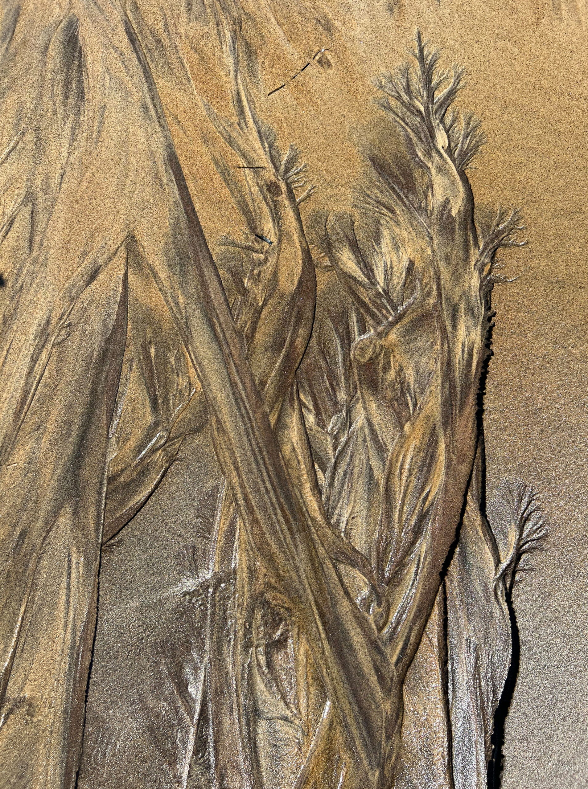 Each day, the landscape transforms under the influence of runoff, erosion, and sediment. The sand, unstable and alive, becomes a shifting canvas where fleeting artworks emerge, reminiscent of natural watercolour paintings. These patterns, shaped by the rhythm of the tides, appear and vanish without ever repeating, silent witnesses to impermanence.